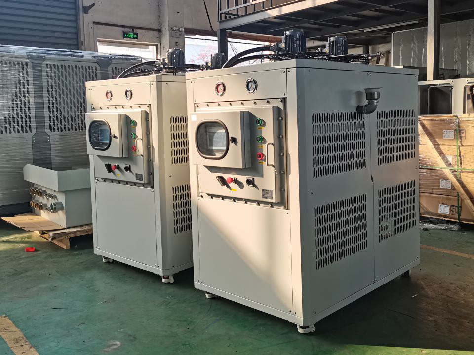 防爆冷水機(jī)組 螺桿式防爆制冷機(jī)組 復(fù)疊式超低溫防爆冷凍機(jī)組用于(如:可燃性氣體,粉塵環(huán)境,煉油、化工、石化,加油站、加氣站等) , 爆炸性氣體環(huán)境 大氣條件下,氣體、蒸汽或霧狀的可燃物質(zhì)與空氣構(gòu)成的混合物 ,在該混合物中點(diǎn)燃后,燃燒將傳遍整個(gè)未燃混合物的環(huán)境。