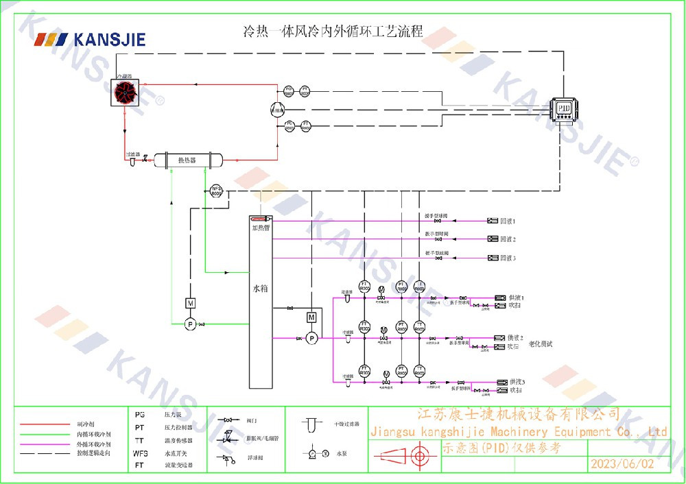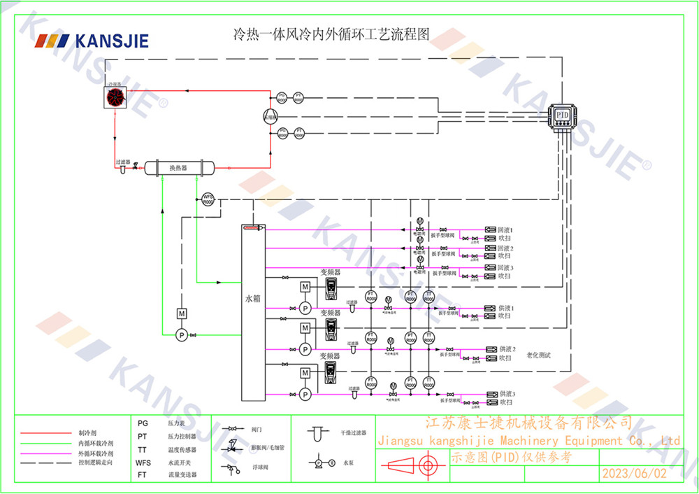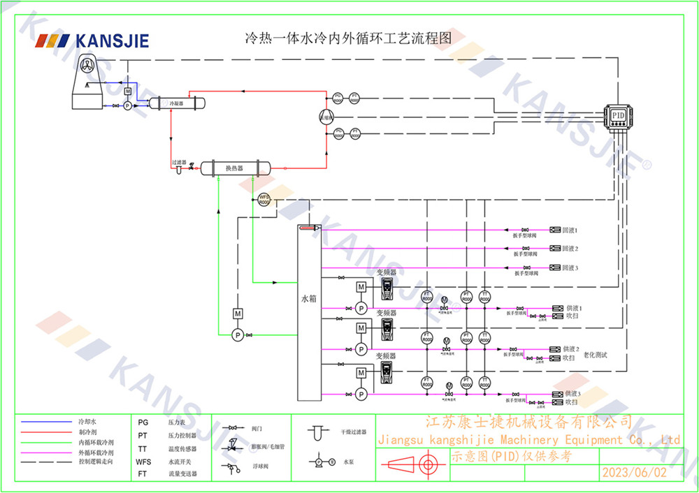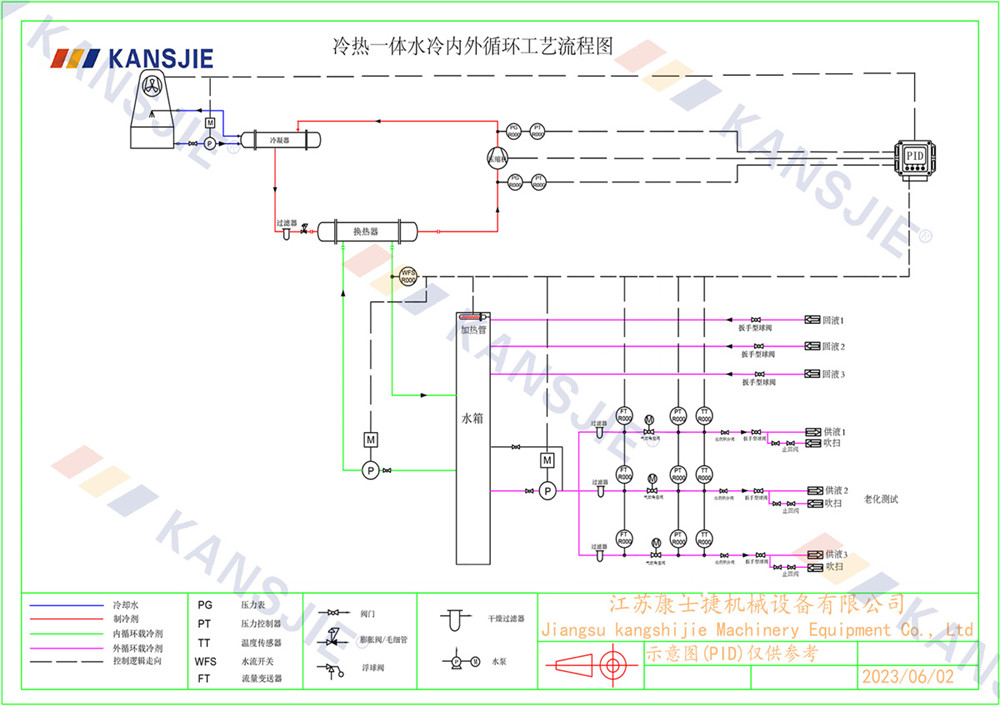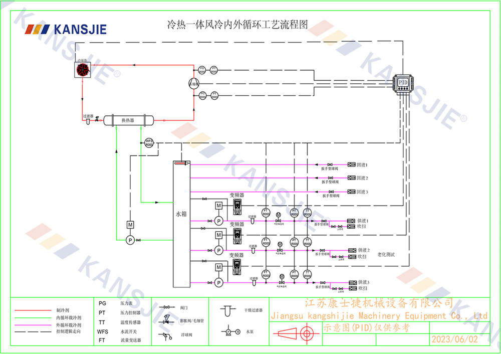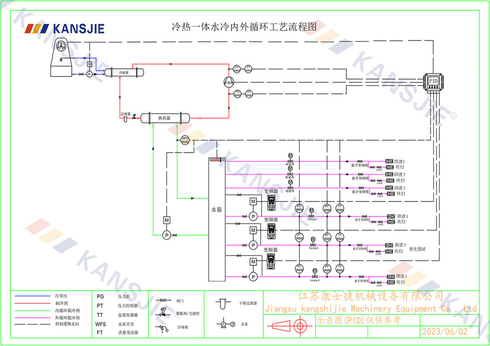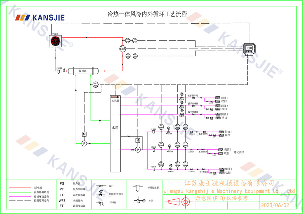 老化測(cè)試制冷系統(tǒng)由壓縮機(jī),冷凝器,蒸發(fā)器,膨脹閥組成,制冷原理是通過(guò)壓縮機(jī)壓縮冷媒,高溫高壓的氣態(tài)冷媒從壓縮機(jī)排氣口排出到冷凝器進(jìn)行降溫散熱,從而實(shí)現(xiàn)把高溫高壓的冷媒冷凝成中溫高壓的液態(tài)冷媒,被冷凝的冷媒經(jīng)過(guò)節(jié)流裝置節(jié)流降壓成半液態(tài)半氣態(tài)的冷媒進(jìn)入到蒸發(fā)器內(nèi)進(jìn)行蒸發(fā),冷媒在蒸發(fā)器中進(jìn)行蒸發(fā)吸熱,把蒸發(fā)器水側(cè)的冷凍水溫度降下去,顯示制造冷水的效果,冷媒在蒸發(fā)器內(nèi)進(jìn)行充分的吸熱蒸發(fā)后再?gòu)膲嚎s機(jī)吸氣口吸入壓縮機(jī)進(jìn)行壓縮,不斷的重復(fù)循環(huán) ,制冷系統(tǒng)正是通過(guò)這一系列的往復(fù)循環(huán)不斷的把冷量輸出到載冷劑中,然后再由循環(huán)泵把載冷劑源不斷的輸送到老化測(cè)試儲(chǔ)液箱中進(jìn)行冷卻降溫。一般老化測(cè)試的大多都是多通道式,并且具備吹掃功能。